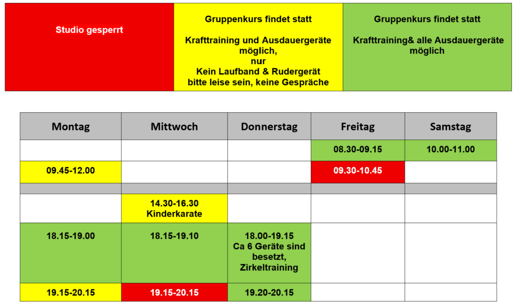 Das Fitnessstudio ist von 05.00-23.00 Uhr geöffnet .Alle Geräte sind hauptsächlich von Cybex. Alle Kleinmaterialien können benutzt werden ( siehe Liste- Klein Geräte ). Da im gleichen Raum Gruppenkurse stattfinden, kann das Studio nicht zu jeder Zeit genutzt werden. Es sind nur wenige Stunden blockiert. Während den Schulferien finden keine – bis nur wenige Gruppenkurse statt , dies ist in der Supersaas App ersichtlich.